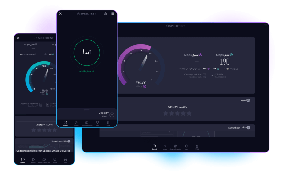 اكتشف سرعة اتصال هاتفك باختبار سهل وبنقرة واحدة—يتسم بالدقة في كل مكان بفضل الشبكة العالمية لدينا. تطبيقاتنا Speedtest المجانية متوفرة لكل من أجهزتي Android و iOS.